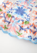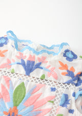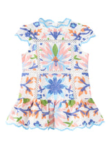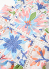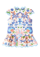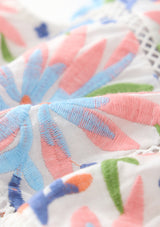 The Sarah Embroidered Mini Dress is a vibrant, playful piece designed in our signature multi-colour embroidery. Featuring scalloped edges, intricate floral panels, and a soft flared mini silhouette, this dress brings charming texture and bright colour to her warm-weather wardrobe. Perfect for birthdays, celebrations, and picture-perfect days out.