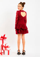 A timeless silhouette reimagined in soft ivory, the Rosella Lace Sleeve Mini Dress captures pure elegance. Crafted in intricate lace with a heart-shaped back cut-out and tiered skirt, it’s a picture-perfect choice for special occasions and holiday celebrations.