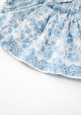 The Lori Embroidered Mini Dress pairs delicate floral detailing with a cool blue base. With bishop sleeves and a fitted bodice, it’s ideal for confirmation dresses Australia or school socials.