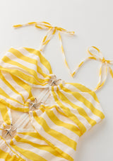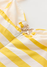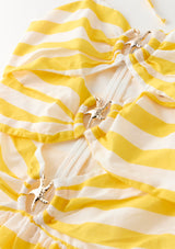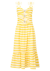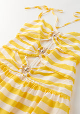 The Raelynn Maxi Dress is a sunshine-ready holiday essential, perfect for resort days that flow from beach to evening dinners. Crafted in vibrant yellow and white stripes, this statement silhouette features cut-outs highlighted with gold-toned seashell trims for a playful nod to coastal charm. The flowing tiered skirt adds effortless movement, making it as chic as it is versatile.