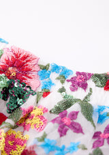 Bloom into the season in the Myla Embroidered Mini Skirt. Adorned with colourful floral embroidery and sequins, this tiered silhouette adds the perfect festive sparkle. Style with the Merry Marlo T-Shirt or a matching embroidered top for a fun holiday look.