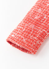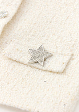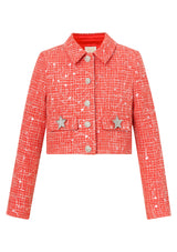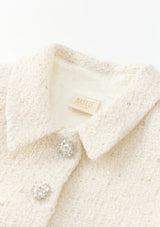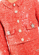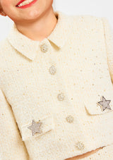 Elevate her holiday wardrobe with the Odelia Tweed Jacket — a timeless cropped silhouette designed to layer effortlessly over matching tweed styles. Adorned with diamanté star buttons and sparkling details throughout, this jacket adds a touch of elegance to every festive outfit. Style with the Odelia Tweed Mini Skirt or Heart-Shaped Top for a coordinated ensemble.