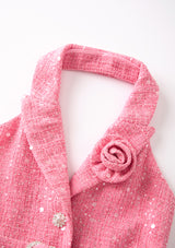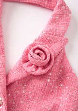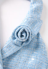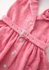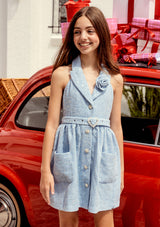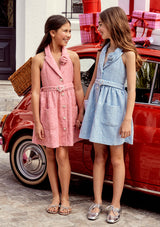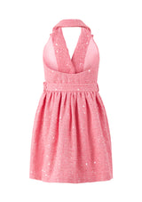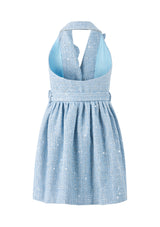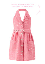 Make merry in the Jingle Dress! Available in two cheerful color options, blue and pink, this dress features a sweet A-line silhouette, halter neckline with a tailored collar and playful details. Perfect for holiday celebrations, this dress brings a fun and festive feel to the season.