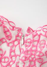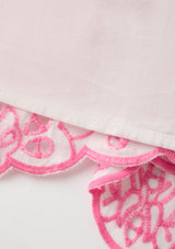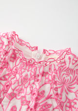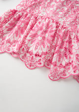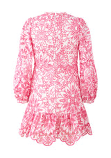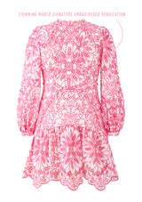 The Makayla Embroidered Mini Dress features embroidered fabrication, long balloon sleeves, and a scalloped hem. This dress offers a charming and elegant look for any occasion.