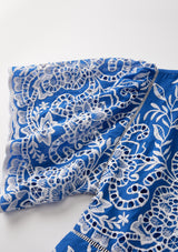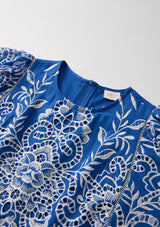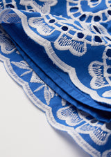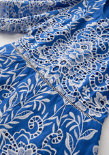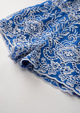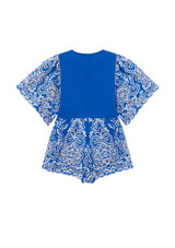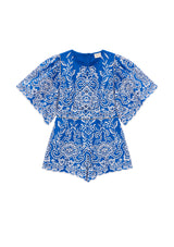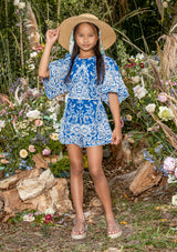 The Marissa Embroidered Romper is both chic and comfortable. With its short sleeves and embroidered detailing in a striking royal blue color, it's perfect for playful adventures or dress-up fun.