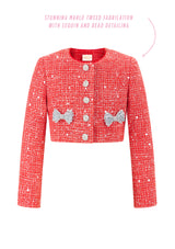 Add a pop of festive cheer with the Jingle Jacket, designed to match the Jingle Top and Jingle Skirt. Featuring a gorgeous tweed fabrication with sequin and bead detailing, this classic jacket sparkles with bow-shaped diamante buttons. This chic red jacket is the perfect layering piece for holiday gatherings, adding warmth and style to any outfit.