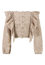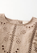 The Otillie Embroidered Top exudes understated elegance. With its intricate stitching and neutral taupe tone, it’s perfect for pairing with skirts or the matching pants for refined occasions, from school socials to celebratory dinners.